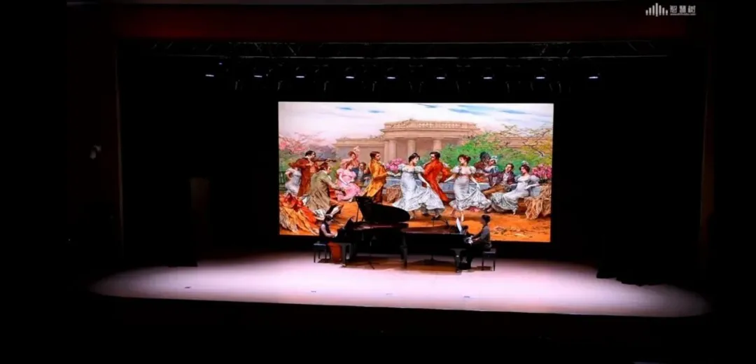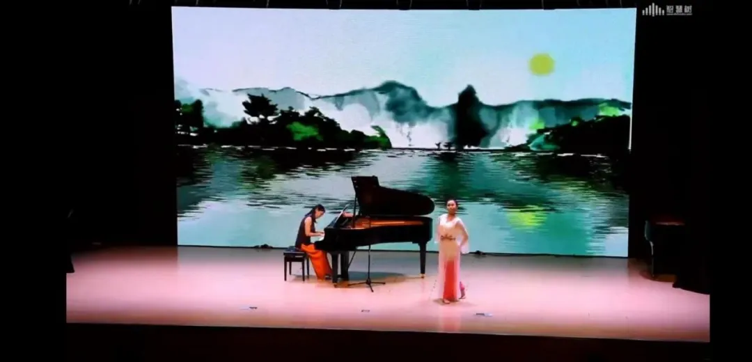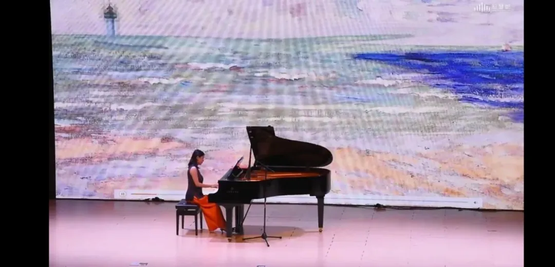 随着主屏幕画面的不断更迭,隋歆老师先后演绎了《平湖秋月》《德彪西<小组曲>》等中外经典作品。其中《平湖秋月》本名《醉太平》作为我国广东音乐中一首非常有名的器乐曲,经陈培勋先生改编之后,乐曲旋律更加明媚流畅,音调婉转,着力描绘了中国江南湖光月色、诗情画意的夜景。隋歆老师的琴声与台上女舞者轻缓动人的古典舞,互为相衬表达了旋律中对大自然景色的感受与热爱。