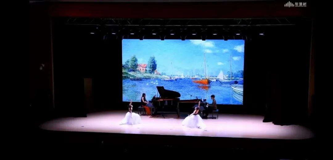 音乐会以视听同感“无边界”“更自由”为概念,选取中外不同时期的优秀音乐作品,通过钢琴这一古老传统而伟大的乐器作为主体,尝试与绘画、舞蹈、多媒体计算机交互技术进行演绎,从而产生对话、传递、延伸、转化、直至交融,呈现出多种表现元素和形式,多方位体会音乐带给我们的全新感受和意义,提供身心沉浸式的体验。在《德彪西<前奏曲组曲>》的演奏中,隋歆老师以优美高超的琴技,拉开了本次演出序幕,将乐曲清新而优美的五声调式特点主题,用流畅旋律和着三拍子节奏交相呼应得以呈现。