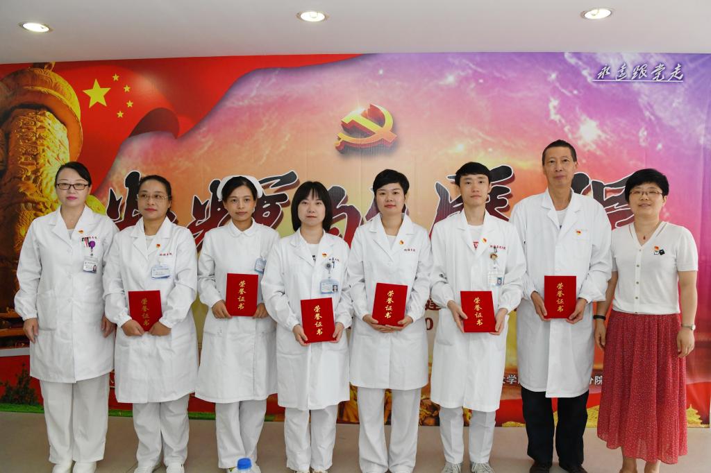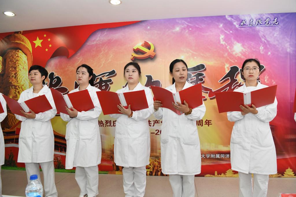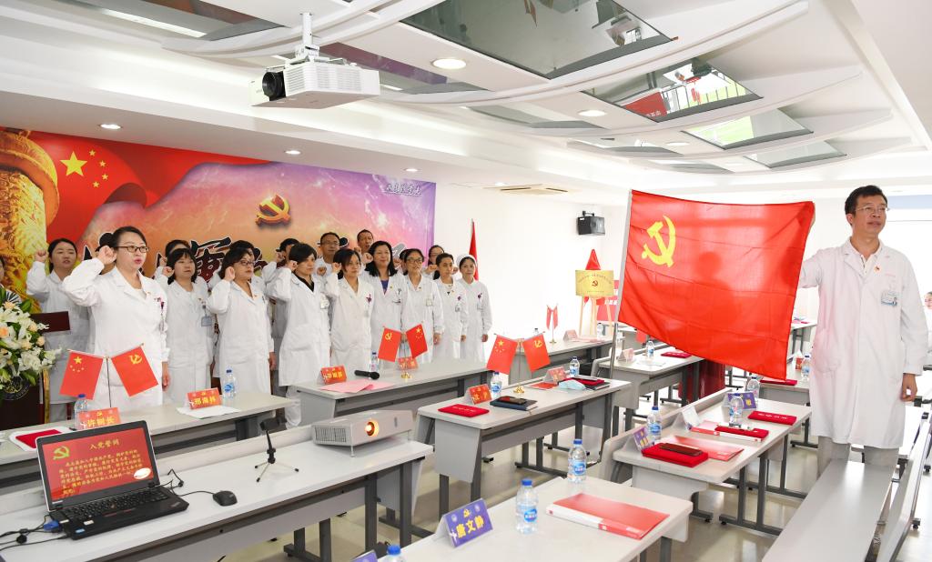 党员们表演了配乐诗朗诵《光辉的历程》、合唱《我和我的祖国》等节目。他们表示一定要恪尽职守,扎实工作,为卫生事业贡献智慧和力量。最后,党总支组织全体党员集体宣誓,重温入党誓词。(图/周游)