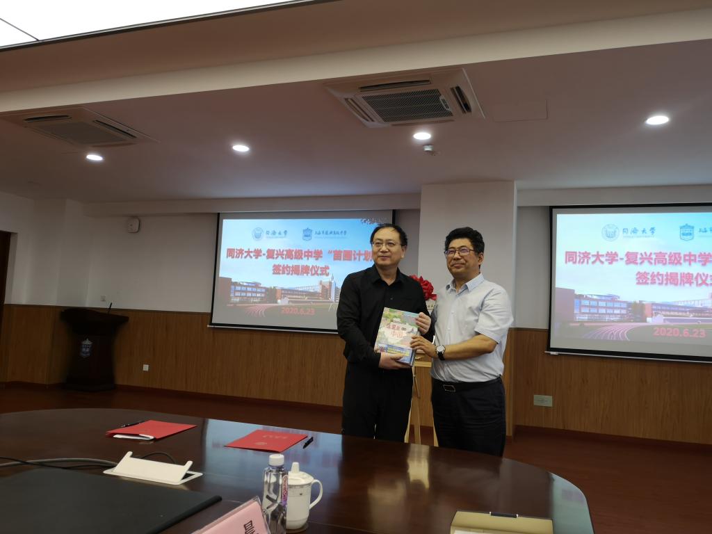 吕培明表示,高等教育前移可以使中学生提前感受大学生活,发现自己的兴趣和特长。希望两所学校认真衔接,抓好落实,做出特色。他还向复兴高级中学捐赠了我校建筑与城市规划学院组织师生联合编著的最新成果图书《这里是中国》——给孩子的城市简史绘本。
