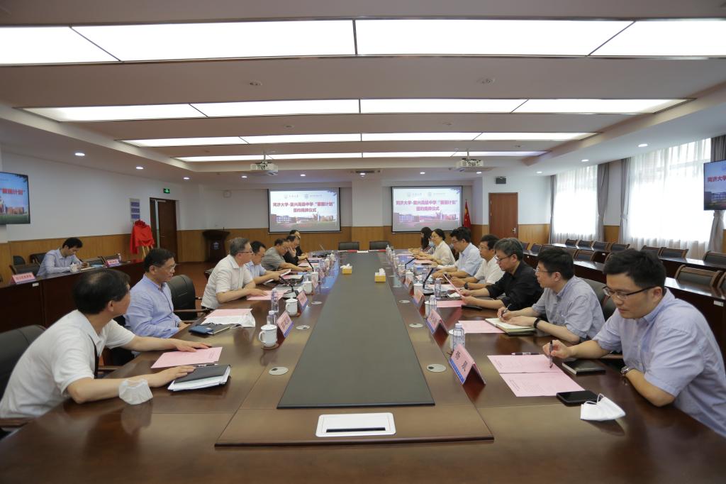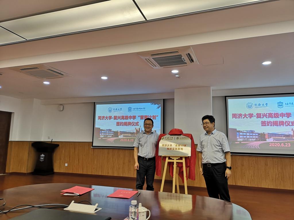 陈宇光与陈永平代表双方签订《同济大学——复兴高级中学“苗圃计划”协议》,吕培明与张雷共同为同济大学“苗圃计划”复兴高级中学基地揭牌。