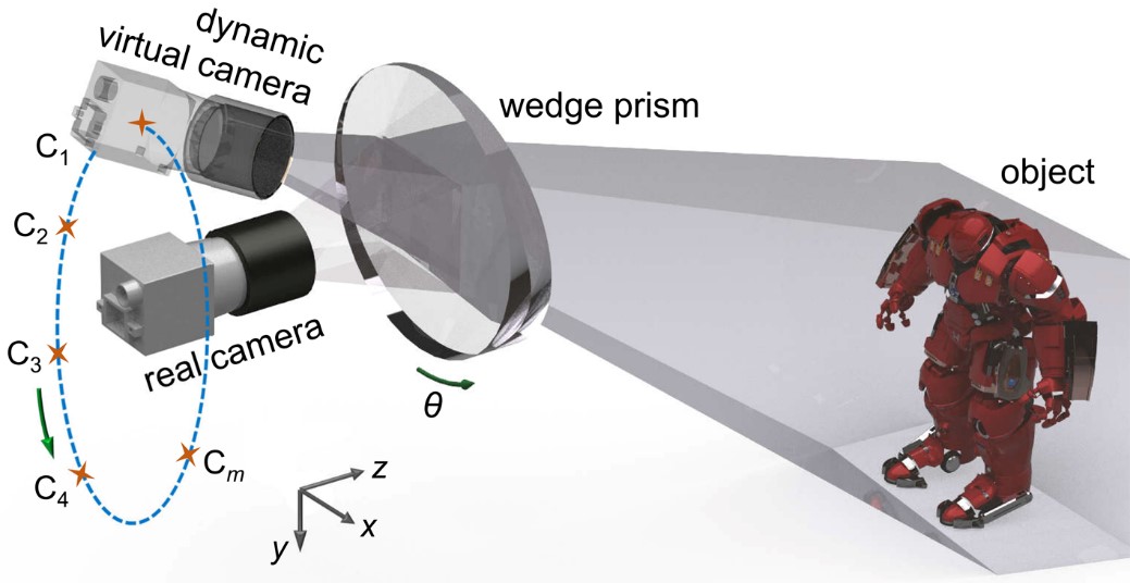 2020年7月1日,国际著名光学期刊《Optics Letters》以“Compact three-dimensional computational imaging using a dynamic virtual camera”为题报道了同济大学机械与能源工程学院李安虎教授课题组在三维成像领域的最新研究成果(Opt. Lett. 2020, 45(13))。研究人员开创性提出动态虚拟相机三维成像方法,通过控制光学元件的平滑旋转运动实现单相机成像视轴的连续精确调整,以此产生沿特定路径运动的动态虚拟相机。该虚拟相机可从无数个不同视点观察和捕获目标场景的全视场、高分辨率图像序列;利用虚拟相机运动规律和位置姿态的可追溯性,可构建同源多视角图像信息的多重几何约束和快速匹配方法;再结合反向光线投影方法和三维计算重建方法,即可恢复空间目标场景的三维姿态、轮廓形状和纹理分布等有效信息(图1)。