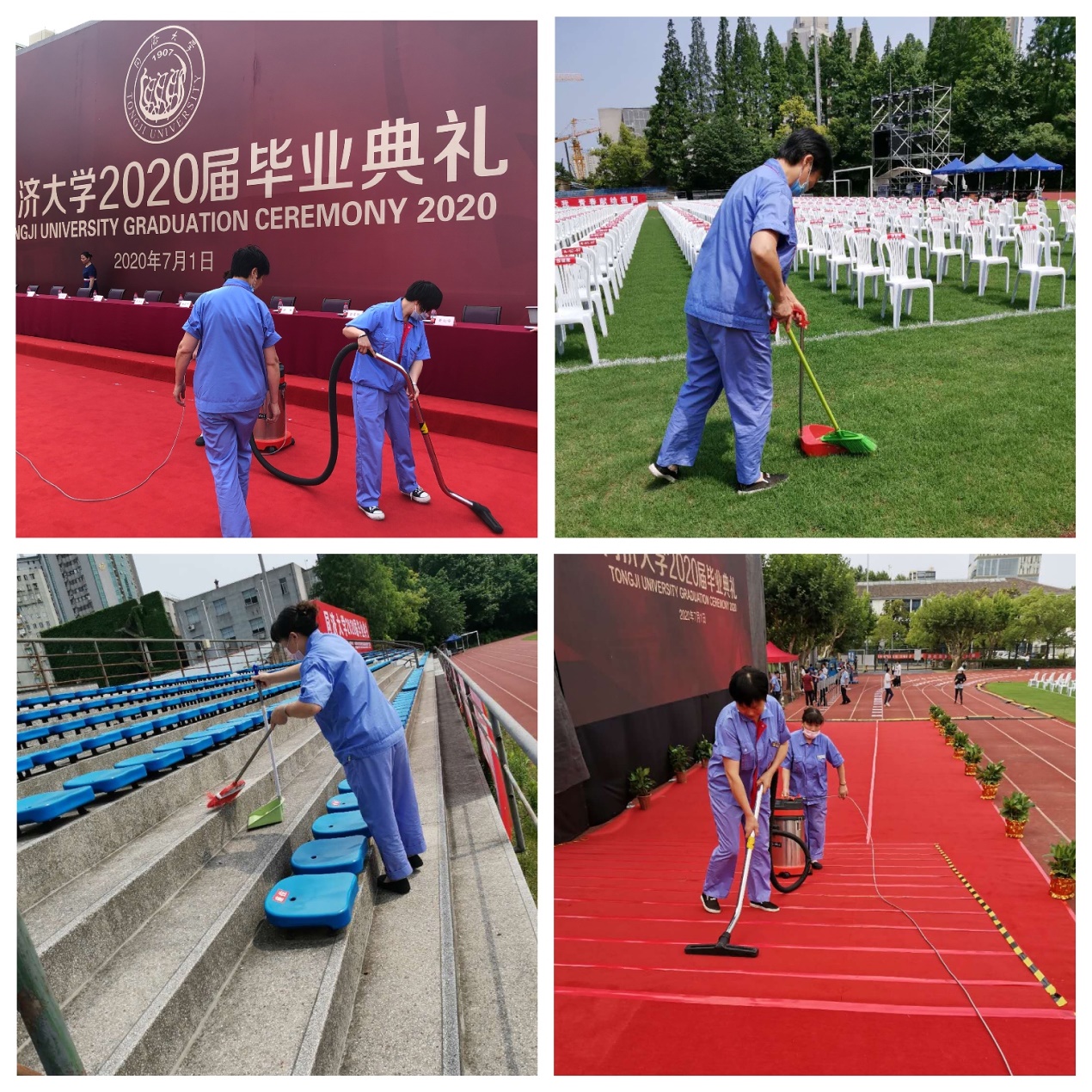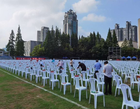 会务中心根据学校和后勤集团的毕业工作方案,特别成立毕业典礼工作协调小组,从前期的准备、到场地安排和会场布置,再到整个典礼的过程,会务中心认真落实各项工作细节,全程在典礼现场沟通和协调各项工作。由于今年疫情的特殊原因,毕业典礼从原来的室内礼堂改至室外操场。6月26日,配合就业指导中心在大操场划线分区域。26日夜间,接收送椅子的卡车。6月28日,部门所有的员工检查3600个座位的摆放,并对椅子进行第一次清洁擦拭。7月1日一早,能离开岗位的员工和中心党支部的所有党员同志和发展对象,对椅子进行最后一次清洁擦拭工作,确保晚上所有参加的师生都能坐上干净的椅子。