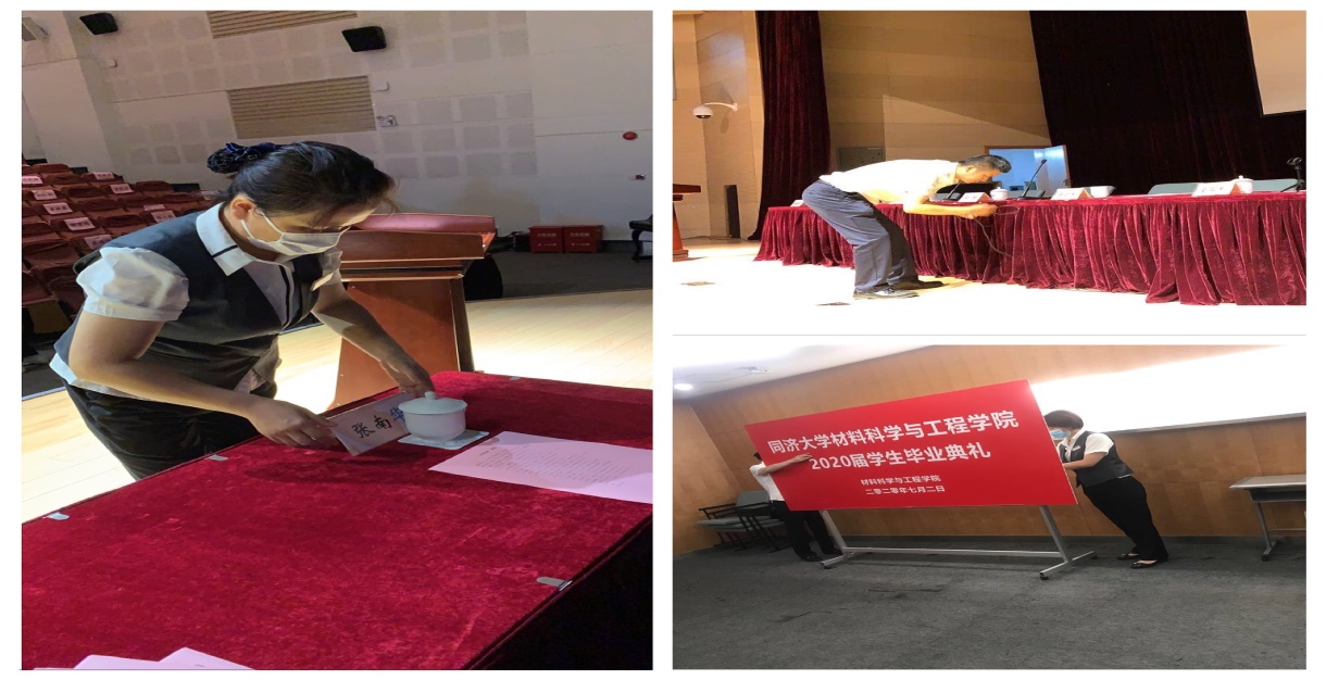 嘉定教学楼宇管理部的服务人员为各学院学生的毕业典礼提供了细致周到的会务服务,包括广告制作、主席台布置、席卡摆放、茶水、矿水、音响调试等。