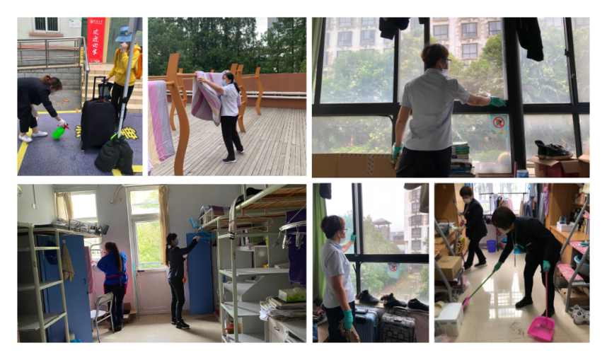 为了迎接毕业生返校,自5月以来,社区中心的各位宿管叔叔阿姨们为了让各位学子安心归“家”,一次次撸起袖子,走进学生宿舍,开窗通风,除潮去湿,整理物品,摆齐桌椅,清扫垃圾,全面消毒,只为给毕业生创造一个干净卫生、空气清新的宿舍环境。每清理一间寝室,社区工作人员就及时对楼道、公共卫生间、垃圾箱等公共区域进行“地毯式”消毒,守护宿舍“健康防线”。