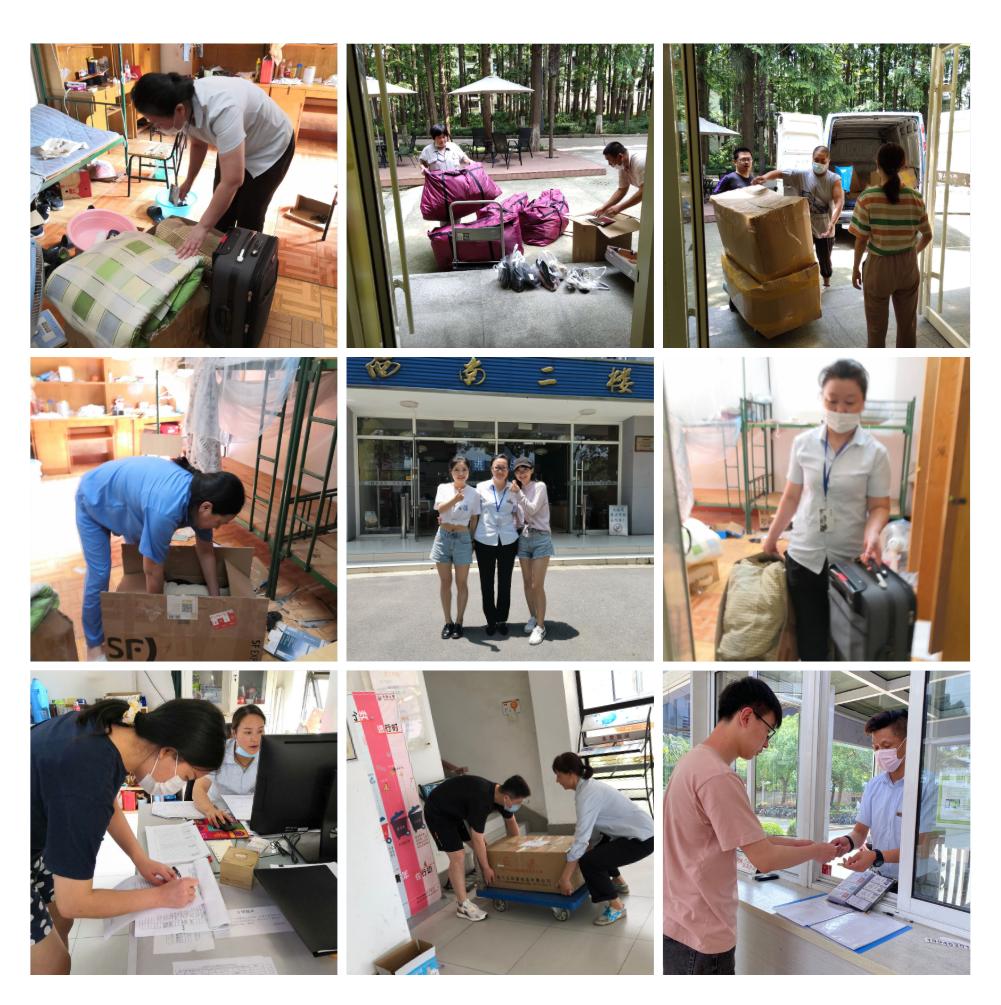 为减少人员聚集和流动,为学生提供细心周到的服务,学生社区配合学校统一部署,联系快递公司为毕业生提供行李托运服务,保证学生行李托运顺利安全,既有速度,又有温度。对于因特殊情况无法返校拿取行李的同学,宿管叔叔阿姨们更是以高度的社区责任心,为学生细致入微地整理物品、打包行李。为了避免遗漏,她们全程用手机与毕业生视频连线,用自己的劳动和汗水,为同济毕业学子送上了一份“别样的毕业礼物”。