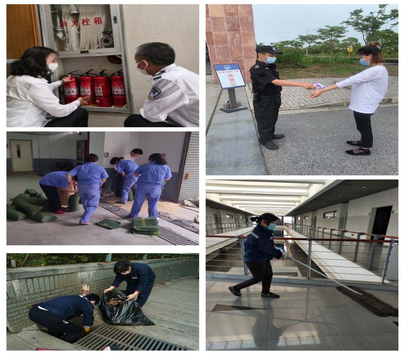 无论烈日与风雨,物业员工们始终如一默默坚守在各自的岗位上,秩序维护员做好大楼人员进出登记、体温测量、车辆指引等,保洁员做好各楼宇日常公共部位的消毒、清洁,管理人员对楼内设施设备进行安全检查等。目前正值梅雨季节,各部门还做好了防汛物资的储备、阴沟的清理打扫等防汛防台准备工作。