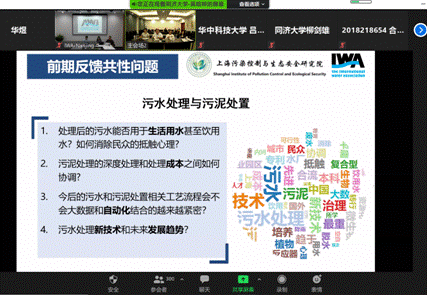 8月10日,由同济大学牵头的上海市环境与生态IV类高峰学科“云端实习”系列讲座之第十五讲暨课程结业仪式举办。国际水协会(IWA)大中华区总监李涛博士,中南建筑设计院股份有限公司建筑综合设计院总工、雷神山医院水处理设计总师洪瑛,苏伊士环境集团水务技术与方案商务总监朱海,上海泓济环保科技股份有限公司技术总监何蓉等校外导师,同济大学环境科学与工程学院院长、上海污染控制与生态安全研究院院长戴晓虎和邓慧萍教授等校内导师,通过“集中答疑”“特色问题连线答疑”等形式,为全国环境学子答疑解惑、指点迷津。