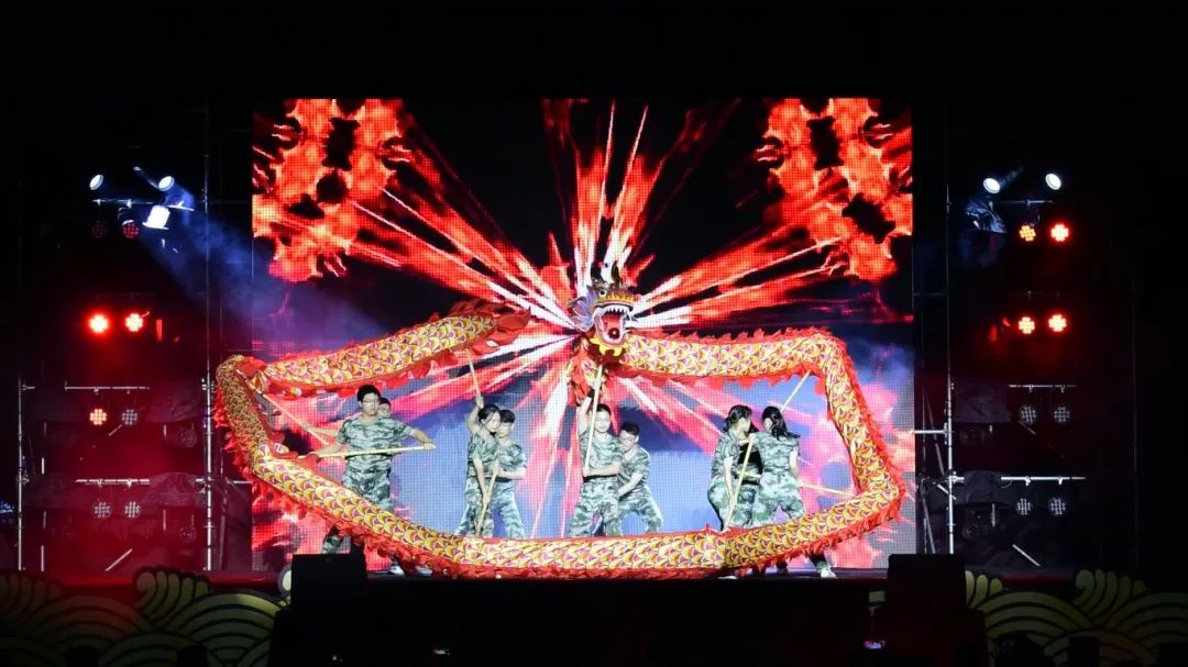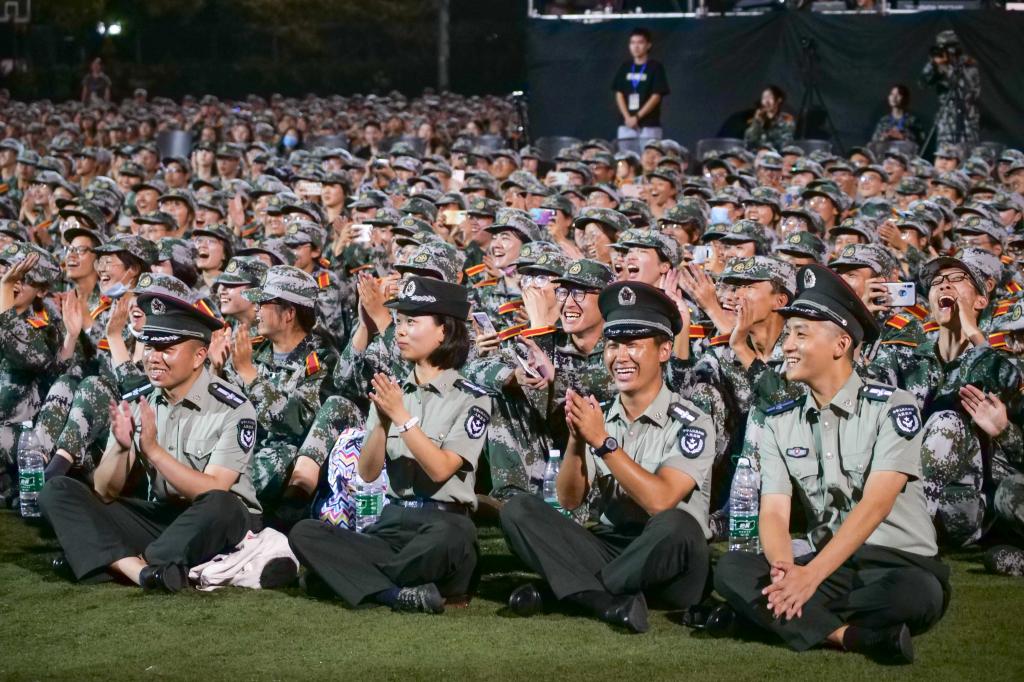 在四平路校区一·二九田径场上,舞龙、舞狮、舞旗等精彩节目轮番上演。同学们用原创rap唱出青春的模样,并和教官们一起改编《无价之姐》《大碗宽面》等舞蹈。带训教师和同学们还现场倾情演绎《向祖国报到,请人民放心》朗诵节目。现场拉歌环节尤为精彩,各营同学热情高涨,相互比拼,声浪此起彼伏。在嘹亮的军歌声中,晚会圆满落下帷幕。