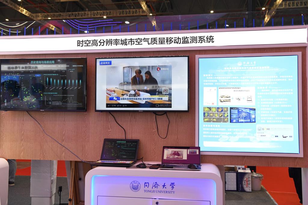 “现在上海市区280辆出租车变身城市空气质量的流动监测站”,这就是机械与能源工程学院谭洪卫教授团队开发的“时空高分辨率城市空气质量移动监测系统”。展台前,工作人员介绍,以城市出租车为载体、嵌入的空气环境传感模块实现了全天候运行、全街区覆盖,秒级高速响应的PM2.5、PM10监测,并可与气象、交通等实现跨领域数据融合,一张助力城市环境精细化管控的城市空气环境数据网正在形成。