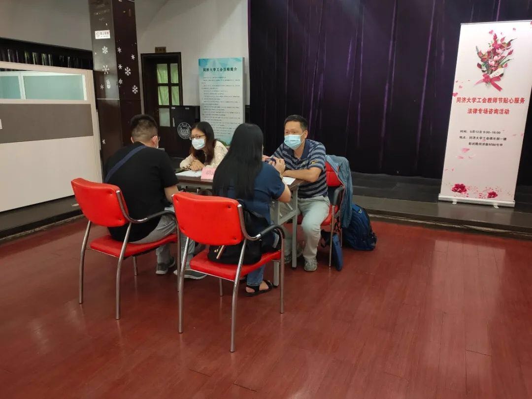 同济大学服务点义务法律咨询活动在四平路校区工会俱乐部举行。校工会选派胡洁人、张韬略、沃田、刘春彦等法学院老师参与了教师的接待咨询活动。他们结合各自深厚的专业理论知识和丰富的实践经验,用专业服务为前来咨询的教职工排忧解难,确保全天咨询活动高品质开展。