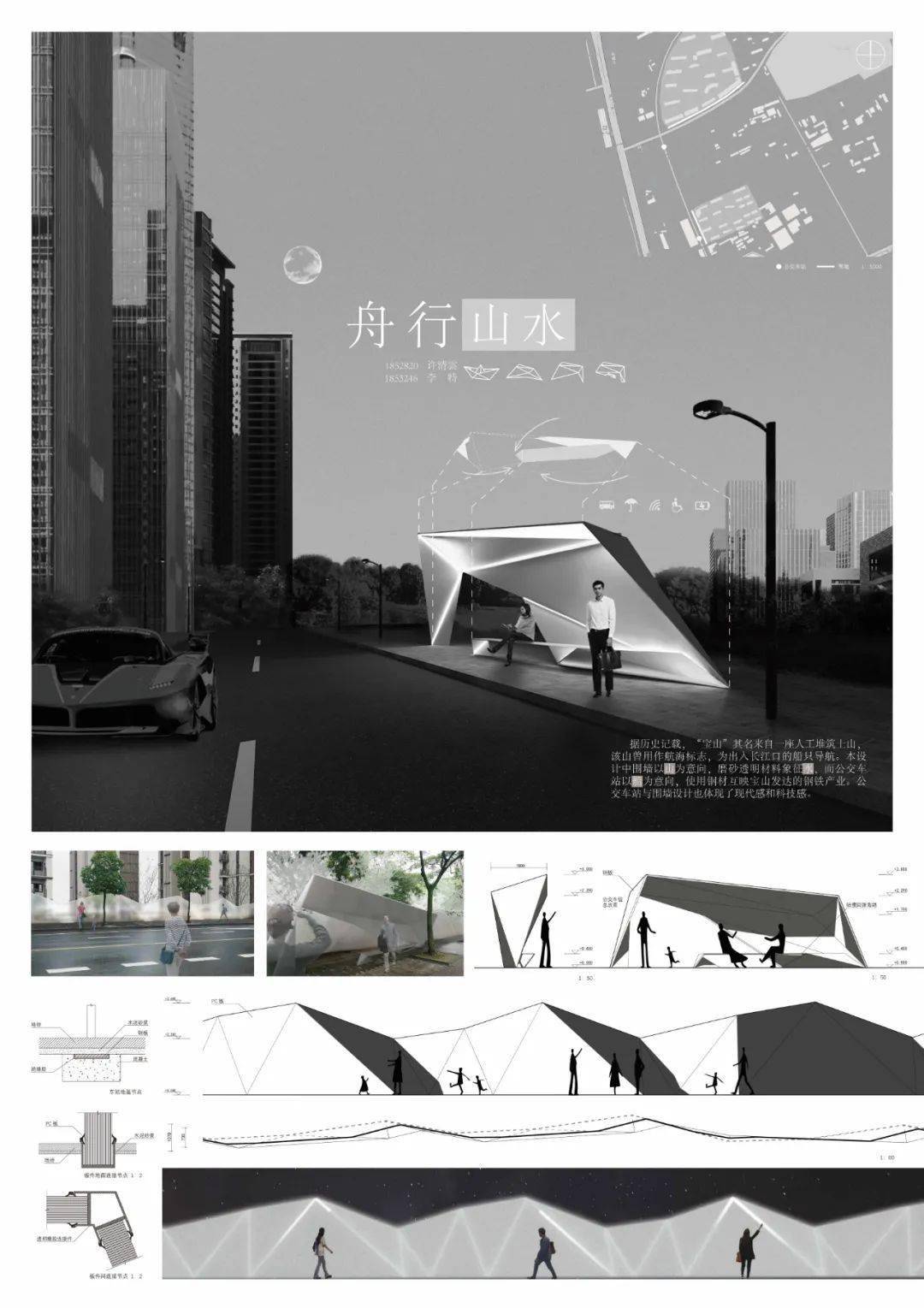 任务三是针对公交站及施工围墙的设计,方案《舟行山水》摘得本组最佳奖。“宝山”之名来自人工筑堆土山,该山曾用作航海标志,方案《舟行山水》的“山、河、舟”意象源于此,并力求占地更窄地去丰富公交站的造型,让陪伴与互动、趣味与诗意兼得。