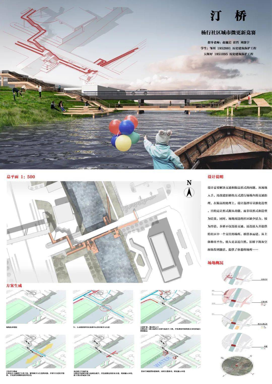 大赛任务一是针对桥梁入口廊架及桥梁的改造,方案《汀桥》以全票摘得本组最佳奖。其天桥设计连接起河道两岸、地铁站和桥下空间,辅以生态激活两岸空间功能,和周围环境与条件的契合度高,可行性强。