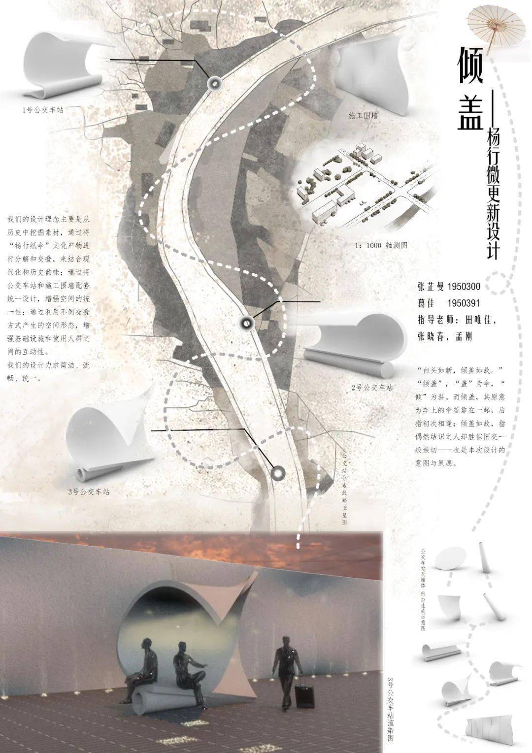 在任务三的设计方案中,最佳人气奖《倾盖》的设计概念最令评委称道。其典故出自“白头如新,倾盖如故”,又以杨行纸伞这一传统文化产物为灵感进行结构,搭建起人与人之间、人与社区之间的联系,用古意赋今日以温度和改变,立意非常巧妙。
