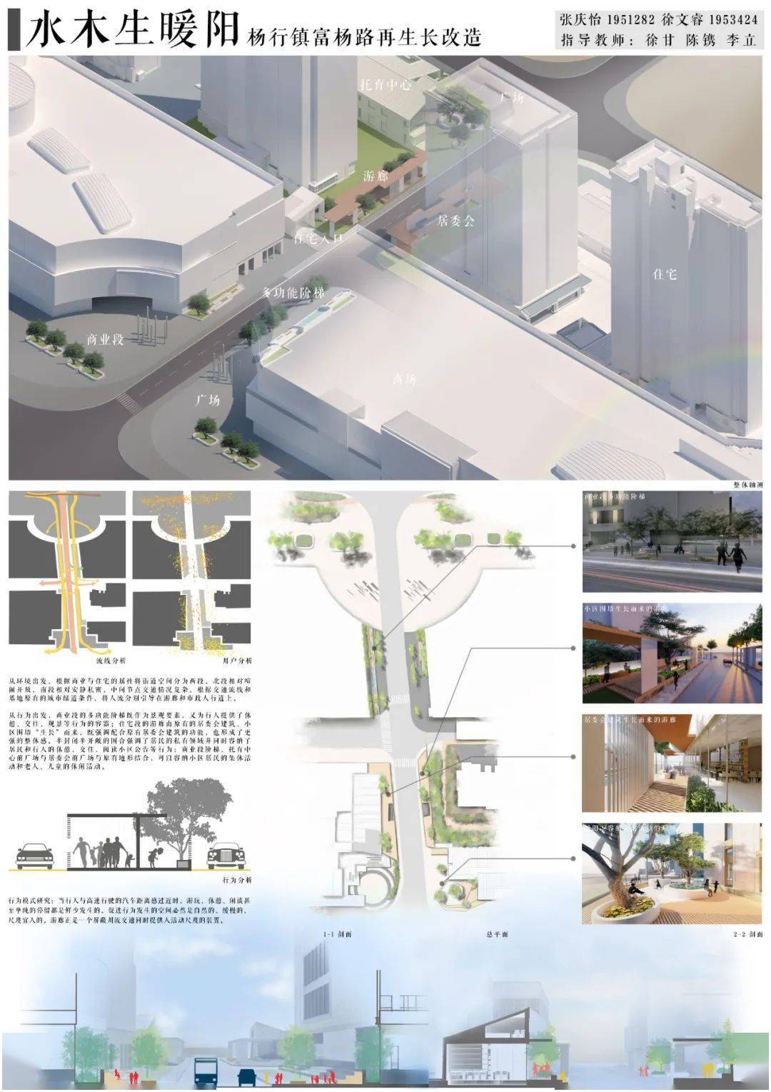 任务二是针对街道两侧的景观设计,方案《水木生暖阳》摘得本组最佳奖,从环境和用户行为研究出发,在不同空间节点提出较为整合的解决方案,并巧妙契合了“暖阳”和“生长”的主题,营造出人们逗留的温馨场所。