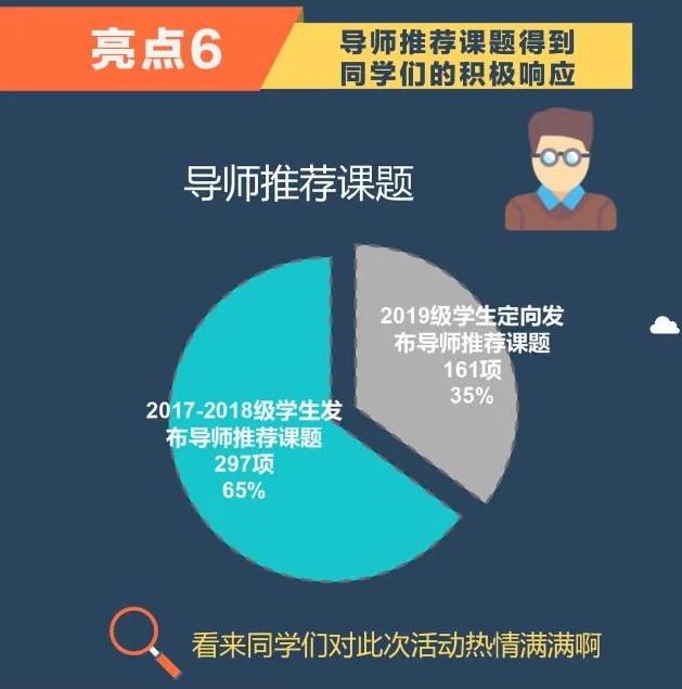 如何培养新生的创新意识和能力一直是新生导师在思考的问题。在2019级新生导师中,共计来自28个学院的143名新生导师带领946名新生参与231项校级大学生创新创业训练计划(SITP)项目,帮助新生在科创土壤中生根发芽。与去年相比,大一新生参加率增长79.5%,2019级学生定向发布导师推荐课题占总项目的35%,22%的新生导师参与创新创业项目的指导。这些数据的背后是新生对于创新创业的热爱和新生导师营造“双创”氛围的辛勤付出。