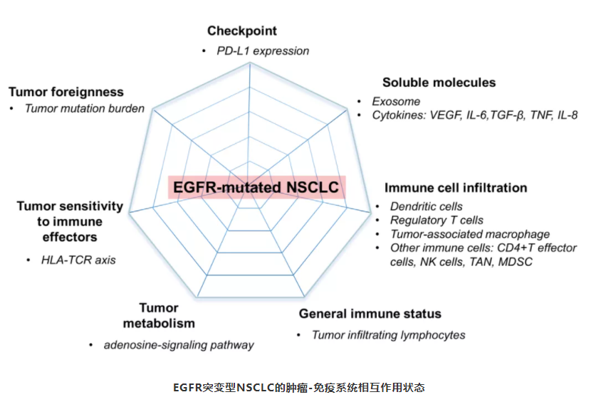 基于以上问题,该篇综述详尽地阐释分析了PD-1/PD-L1单抗在EGFR突变型非小细胞肺癌中的应用。首先,文章总结了免疫检查点抑制剂对EGFR突变型非小细胞肺癌患者疗效的临床证据,发现“EGFR突变型非小细胞肺癌对PD-1/PD-L1单抗单药反应差,但与化疗或抗血管的联合治疗可能会改善其临床预后”。随后,文章以Blank提出的“肿瘤免疫图谱”为理论基础,详尽阐述了EGFR突变型非小细胞肺癌的肿瘤-免疫系统相互作用状态,进而从肿瘤免疫的角度剖析了此类人群对免疫治疗疗效不佳的可能机制。