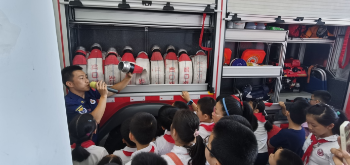 在北外滩消防站指导员王硕的带领下,小朋友们还参观了消防车辆器材和消防车库,零距离接触了消防器材,聆听了消防车辆和器材装备的性能、用途及使用方法的相关介绍,学习了如何在日常生活中防火,遇到火灾时怎样逃生,如何保护自己以及报火警等知识。