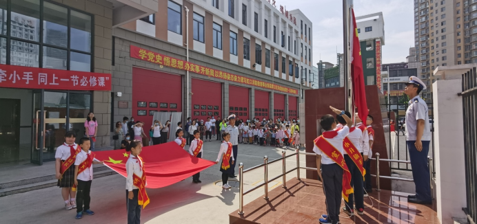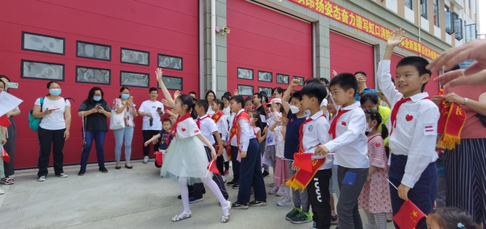 活动在慷慨激昂的行进乐中拉开序幕。主持人为在场的小朋友们送上最真挚的节日祝福。在升国旗环节里,伴随着激昂的音乐,来自虹口区消防救援支队的战士们与少先队升旗手、护旗手们一起,踏着整齐划一的步伐,护送国旗走到升旗台前。当嘹亮的国歌声响起,少年们昂首挺胸,凝望五星红旗冉冉升起。