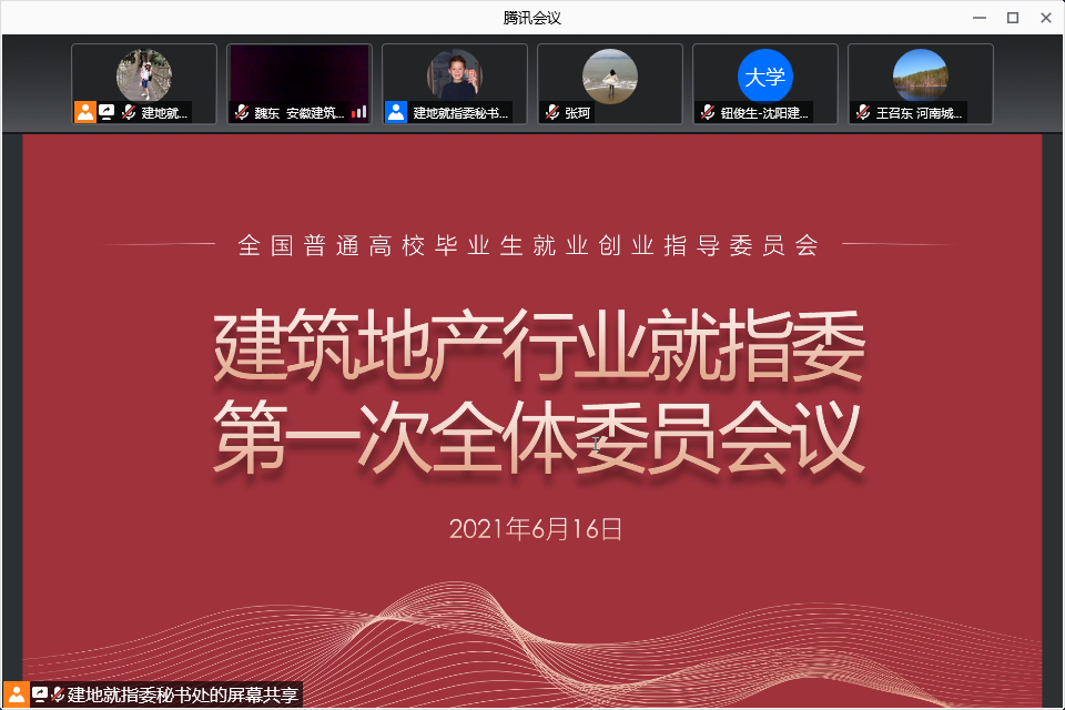 6月16日,全国普通高校毕业生建筑地产行业就业创业指导委员会第一次全体委员会议在线召开。建筑地产行业就指委主任委员、我校党委副书记彭震伟,住房和城乡建设部人事司二级巡视员何志方,市政类就业指导组组长、北京林业大学副校长李雄,建筑类就业指导组组长、沈阳建筑大学副校长张珂,华东建筑集团股份有限公司人力资源部(组织部)主任王玲等副主任委员以及来自机关、高校和企业的委员参会。会议由彭震伟主持。
