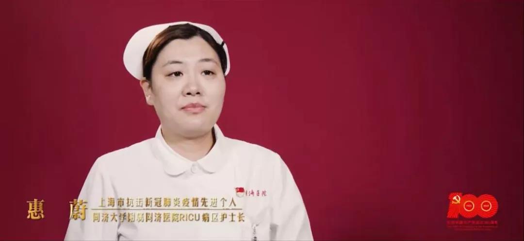 上海市抗击新冠肺炎疫情先进个人、附属同济医院RICU病区护士长惠蔚说:“作为一名医务工作者,面对新冠肺炎疫情,必须冲锋在前。去年除夕夜,我作为上海首批驰援武汉136名医务人员中的一员,感到十分光荣。到当时疫情最严重的地方,到祖国和人民最需要的地方去。我心里深知,唯有我们拧成一股绳,我们才能战胜疫情,守护好祖国和人民。在前方的时候,我被身边的党员战友感动,那是共产党人的热血澎湃,那是一种舍身忘死的崇高精神。在那一刻,我决定了人生信仰——‘永远跟党走’,我在金银潭医院临时党支部火线加入中国共产党。”