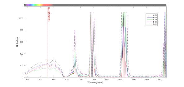 大沽河和莱西湖的水样光谱反射曲线均在波长700nm和800nm处出现了较明显的反射峰,从而团队成员初步判断,这两个地区的水体中均含有一定量的固体悬浊物和藻类。