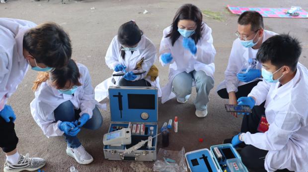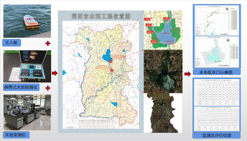团队成员依据点位图前往大沽河和莱西湖,采用“天空地一体化”水质监测体系,“天”“空”“地”三线并行,充分发挥该体系快速、直观、全面、低成本、集成性强等优势,对研究流域开展全面调研,为水质评估插上智慧翅膀。同时,团队成员利用该体系进行污染溯源,从水体外观、水质指标数据、历史水环境演变等多个角度分析莱西市水环境现状。