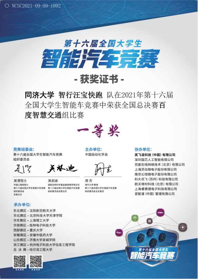 百度智慧交通组赛项场景化地复现基于深度学习的智能车在实际领域中的应用,尤其是在无人的环境中,实现数据采集、数据模型构建、自主识别弯道、无人驾驶验证等多种技术融合的场景,契合人工智能时代发展特点,充分调动学生的创新、创造活力。参赛队伍需要在规定时间内完成车道定位及识别、交通标志与指示牌的检测和识别、目标物检测与识别等任务。由于百度组比赛需要自己制作车模,受防疫限制无法举办线下决赛。我校“智行•汪宝快跑”队由电子与信息工程学院康富(自动化)、汪君令(自动化)、陈雨佳(电子科学与技术)3位大三学生组成,指导教师为张志明和朱劲,在与清华大学、上海交通大学、哈尔滨工业大学等全国高校战队同场竞技后,以东部赛区第8名的成绩,获得全国一等奖。