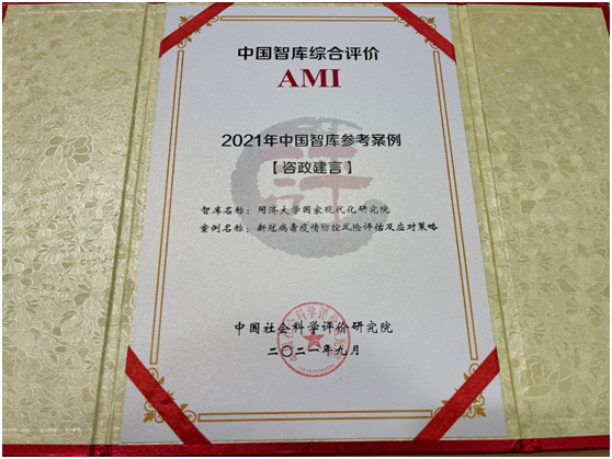 近日,中国社会科学评价研究院主办的“第四届中国智库建设与评价高峰论坛暨《中国智库AMI综合评价研究报告(2021)》发布会”在京举行,会上公布了第二轮“中国智库综合评价研究项目”智库建设特色案例评价结果,同济大学国家创新发展研究院《构建‘十四五’时期国家科技新生态研究》、同济大学国家现代化研究院《新冠病毒疫情防控风险评估及应对策略》两项研究成果从651份申报成果中脱颖而出,入选2021年中国智库参考案例。
