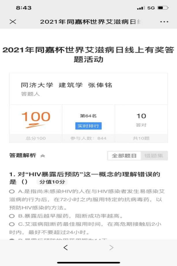 为提高大学生对艾滋病基础及防控知识的知晓率,增强自我安全防护意识,嘉定区疾病预防控制中心与同济大学联合举办“2021同嘉杯世界艾滋病日线上有奖答题活动”,并于11月29日起连续多日在中心微信公众号上同步举办“生命至上 终结艾滋 健康平等”知识宣传。