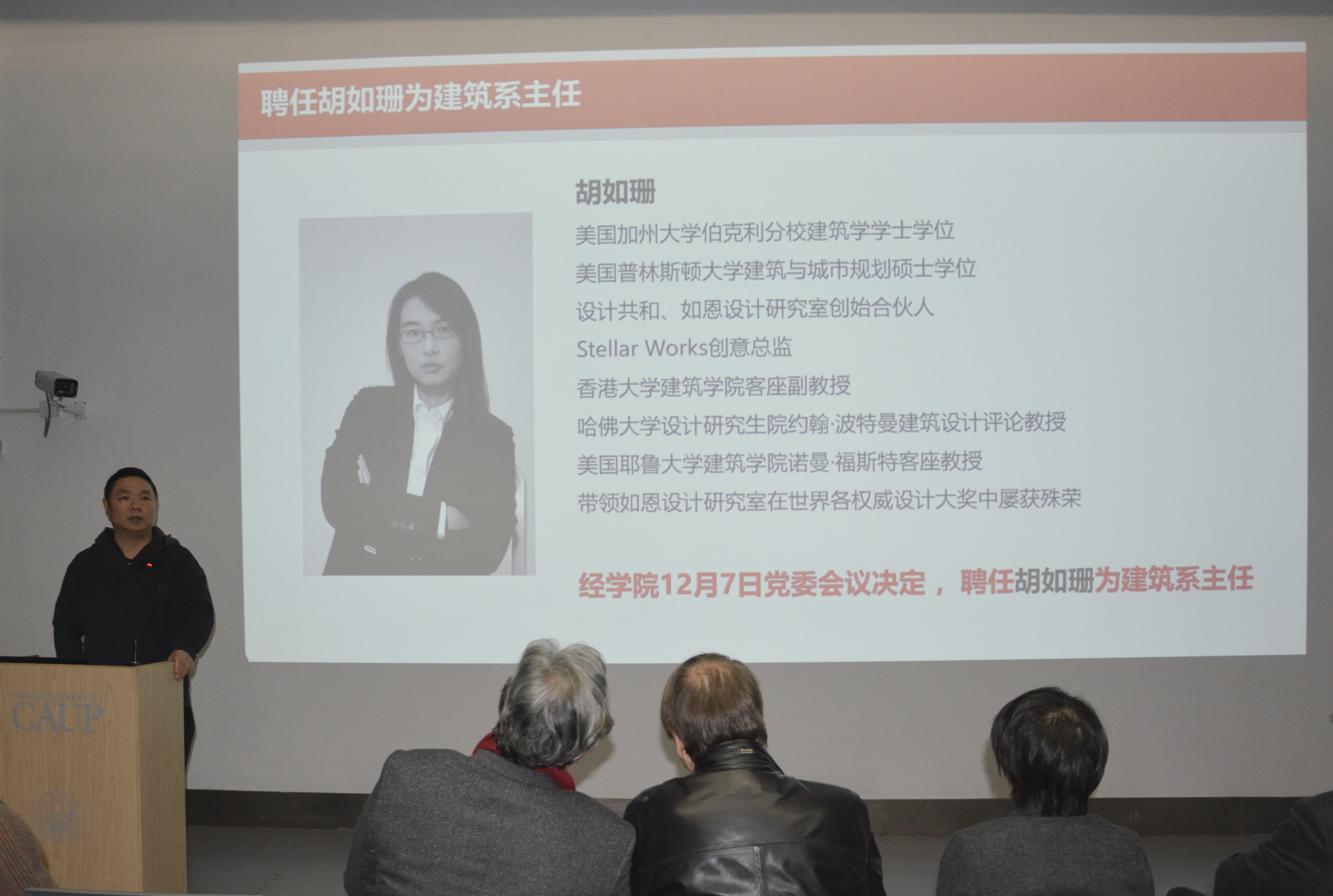 12月21日,在建筑与城市规划学院全院大会上,如恩创始合伙人胡如珊受聘为建筑与城市规划学院建筑系主任。