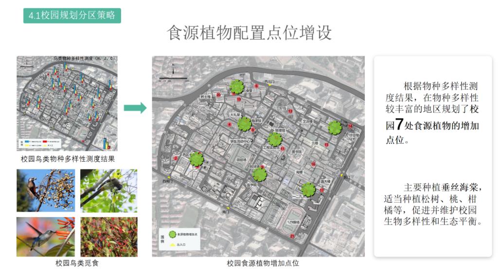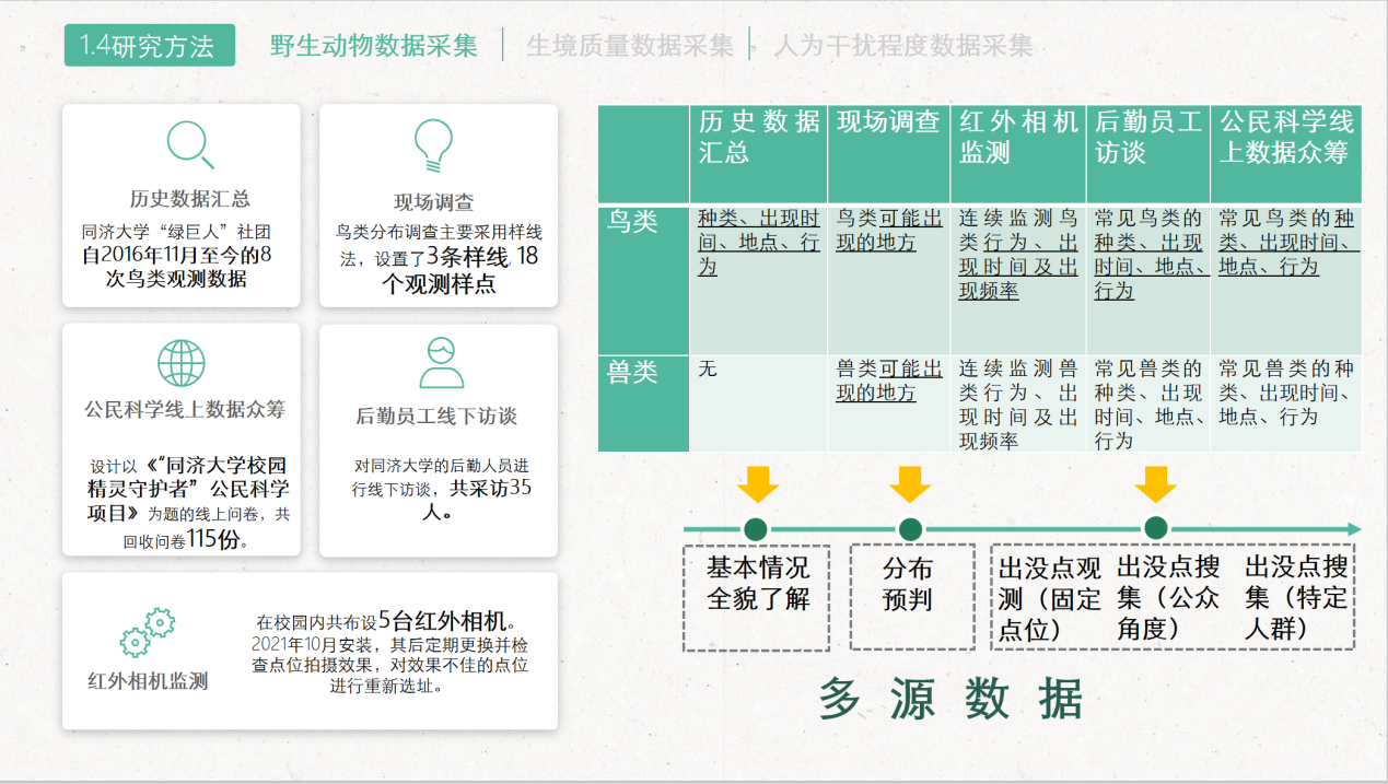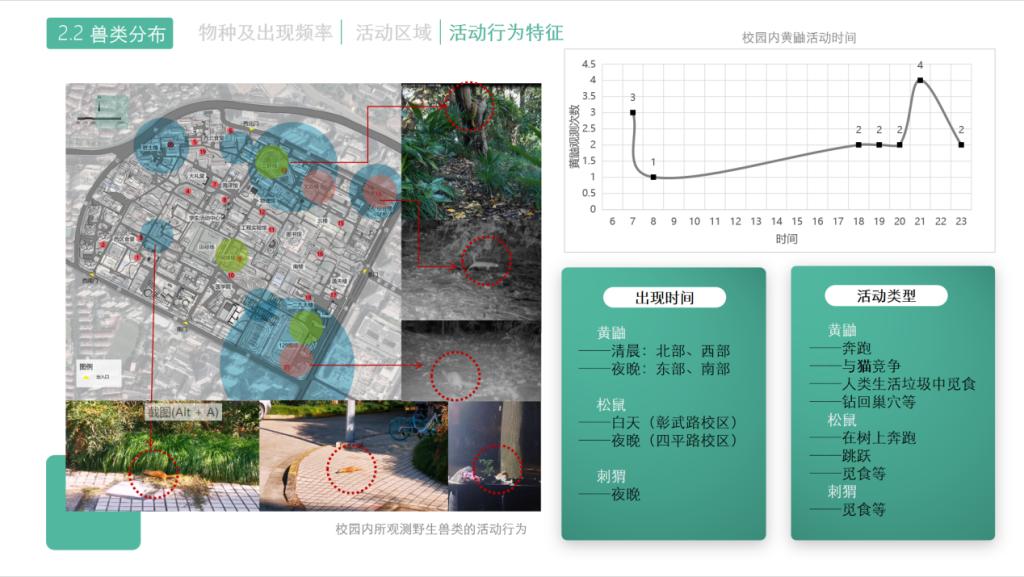 野生动物是城市重要的可持续资源,大学校园通常拥有较大面积绿化,是城市中野生生物重要的栖息地。“基于多源数据的大学校园野生动物分布及其环境影响因素调研——以同济大学四平路校区为例”小组以四平路校区校园野生动物中的鸟类和兽类为研究对象,整合历史数据、现场勘察、线上公民科学数据众筹、线下访谈等多源数据,运用红外相机技术和AcrGIS软件,以定量化数据分析为基础,通过建立野生动物种类、数量、出现频次与校园环境要素之间的耦合关系,分析影响野生动物活动的重要生境因素和人工干扰因素,为校园野生动物保护提供规划分区、场地优化、建筑改造、文化建设方面的建议,为建设野生动物友好型的生态校园环境提供参考。