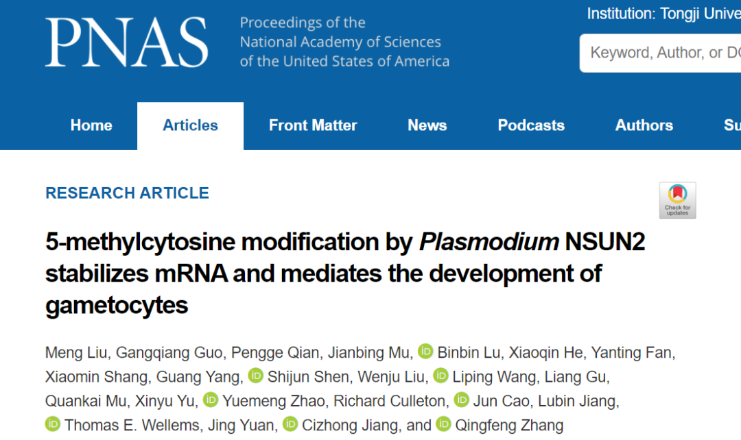 2月25日,我校医学院、附属同济医院教授张青锋课题组联合生命科学与技术学院江赐忠、厦门大学袁晶及美国国立卫生院Thomas Wellems等团队在《美国科学院院报》(PNAS)上发表了题为“5-methylcytosine modification by Plasmodium NSUN2 stabilizes mRNA and mediates the development of gametocytes”的研究性论著,首次揭示了表观转录组调控疟原虫配子生殖的表观遗传调控新机制,鉴定了新调控因子NSUN2并阐明其作用机制,为疟疾传播阻断新措施的研发提供了新靶点。