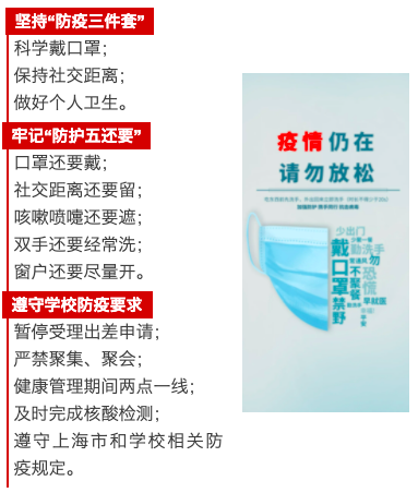 校工会提醒全体教职工,必须继续做好个人防护:坚持“防疫三件套”,牢记“防护五还要”,遵守学校防疫要求。