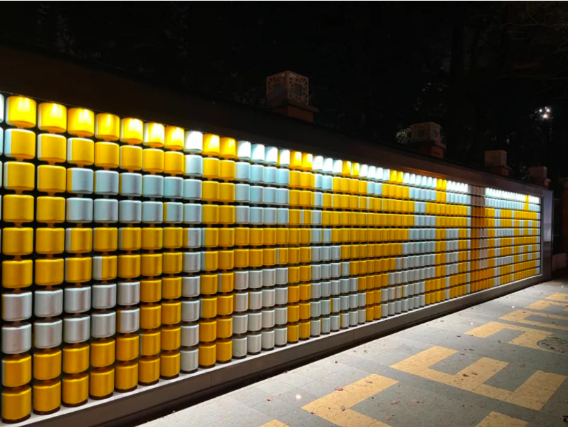 “翻转同济”是上海NICE2035未来生活原型街赤峰路段的一个创意交互装置,由上海筑道城市设计咨询有限公司设计总监、同济大学设计创意学院外聘讲师郭泠设计。800个蓝橙双色圆筒组成的“翻转同济”墙面,每个圆筒都可以随意拨动,转动之下,墙面便会不断地变化出不同的图案色彩。恰好就在公交车站旁,里边是同济大学校园,外面是人来人往的居民区,下班路过、散步经过、等候公交时随手“翻转”一下,不管你是谁,都可以用这面翻转墙“说”几句自己的心里话,或是表达一下当下的感受,有点像个“树洞”。去年设计完成后,“翻转同济”就成为“网红墙”,毗邻校园,墙上出现最多的还是甜甜的表白。“有时候上午是一个人的名字,下午出现的就是另一个人名了。”每天上班都会经过这面墙的郭泠笑道,甜蜜蜜的恋爱告白图案也让这里充满了青春的气息。