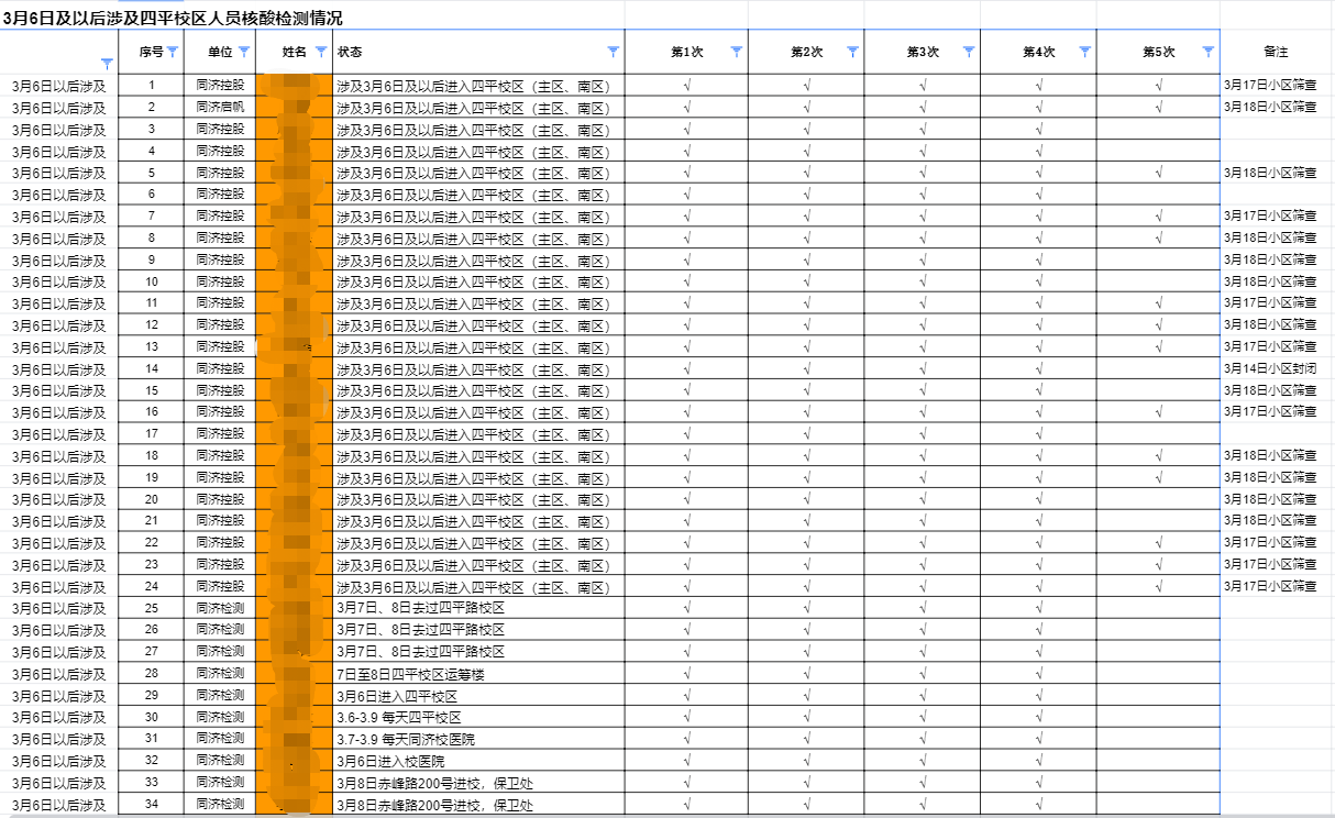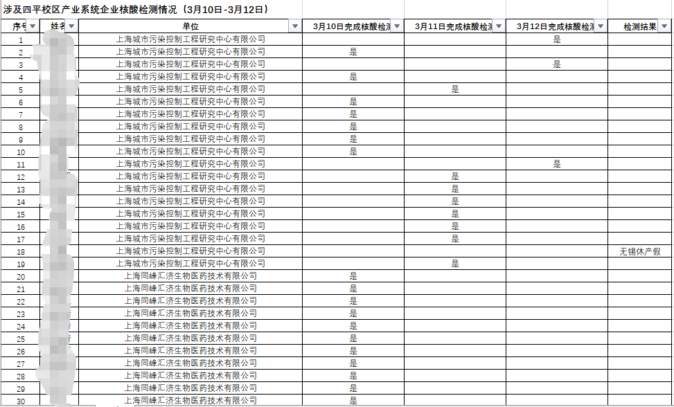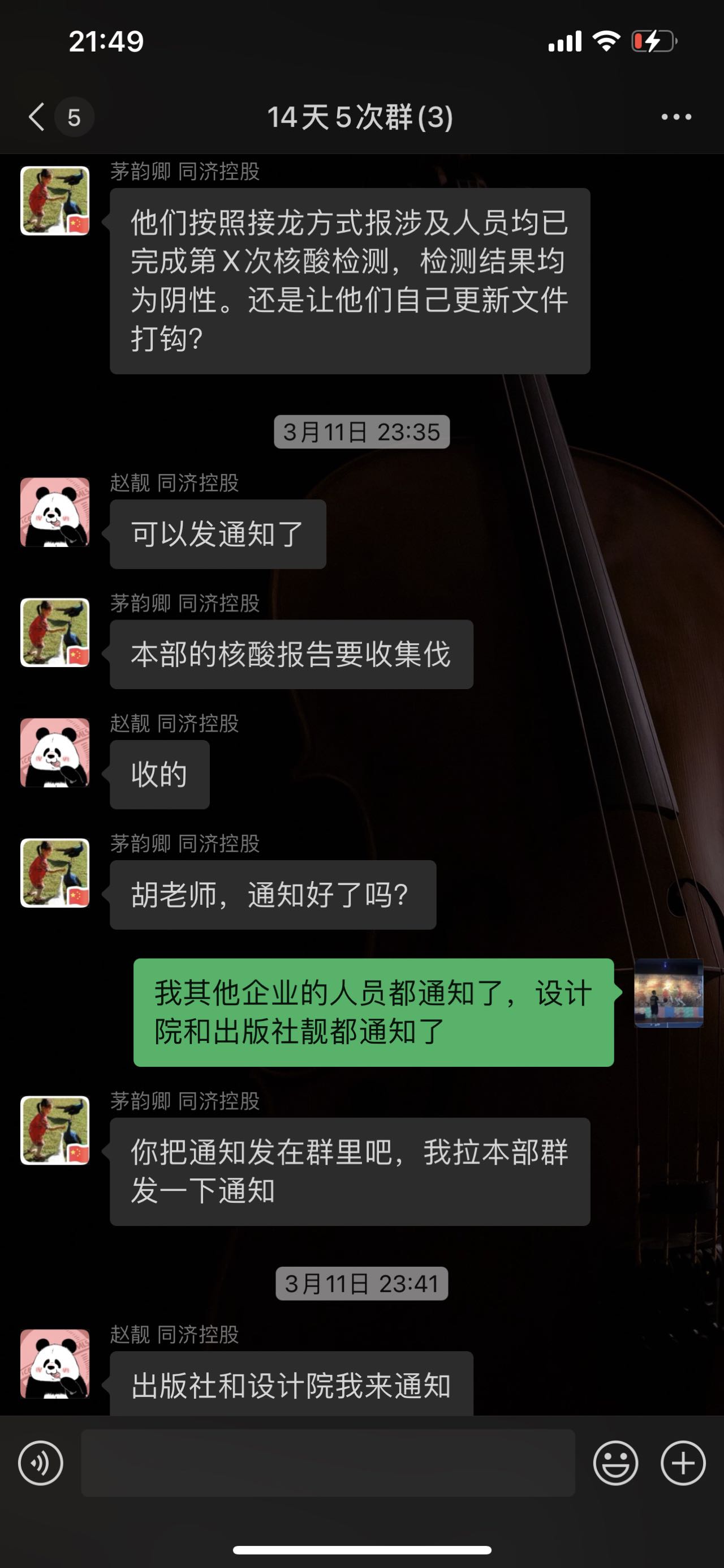 此轮疫情需在短时间内排摸掌握产业系统人员数据,3月9日晚至3月12日是学校人员底数摸清工作最重要的关键时间段。工作时间紧,加之产业系统人员分散,各单位办公场所分散、人员性质不同,校内信息不能直接转发、群发,需要一对一、点对点电话或微信通知,胡震自3月10日起全天24小时待命,值守在电脑前应对各方信息,通过电话、微信,时刻对接产业系统单位疫情防控联络员,传达沟通各类防疫信息。及时跟进产业系统留校人员情况111人、涉及3月6日及以后进入四平路校区的人员168人、各校区范围的全部企业员工4408人以及同济控股管理开通进校权限人员237人的核酸检测情况,根据核酸检测时间点紧跟各单位人员核酸情况。自3月14日起,对产业系统在沪各单位7300余人校内情况、上班情况、居家办公以及拟次日入司人员情况进行统计,严格做到当日汇总、当日汇报,不遗漏一家、不遗漏一人。