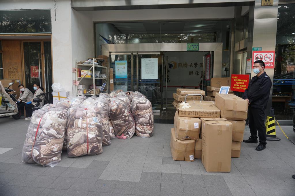 当得知学校学生处发出急需置物架的求助后,赵念带领“特派援”们联系四平路街道服务办,把7个置物架送往铁岭路同济校外博士生宿舍楼下。由周昕翔连夜加班在现场协助完成安装,用于安放隔离同学的快递和外卖。3月14日至今,周昕翔还主动代学校应急采购单层加厚毛毯300件、加固折叠床100张、睡袋150个,并于3月16日下午组织人员将上述用品送至四平路校区,累计发往同济大学校区“闪送”服务6车次。