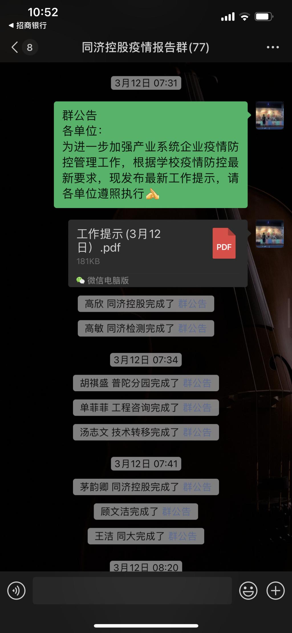 根据学校疫情防控工作要求,同济创新创业控股有限公司第一时间在党委带领下,成立公司疫情防控应急工作小组。公司全体领导干部主动担责,下沉一线,周密布置,精心安排,有条不紊推进产业系统疫情防控各项工作。3月9日晚,产业系统启动疫情防控工作联络机制,同济创新创业控股有限公司协同产业系统各家单位疫情应急工作小组,迅速恢复运转应急组织体系,主动开展人员排查,全面摸清人员底数,不间断、不停歇跟进人员核酸检测情况,根据最新防疫态势及时发布工作提示,积极应对防范各类防疫风险,切实保障产业系统平稳、有序。