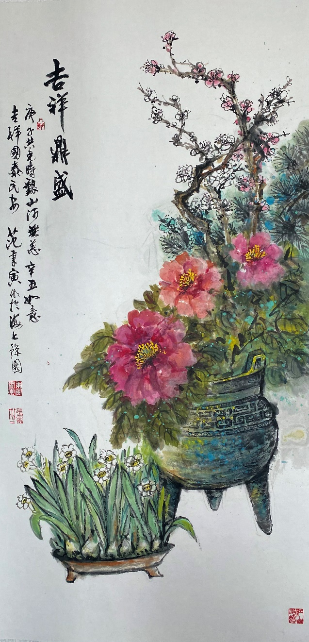 范秉寅创作的《吉祥鼎盛》,以雍容华贵的牡丹花为主体,题字“庚子共克时艰,山河无恙,辛丑如意吉祥,国泰民安”,象征着祖国在取得抗击疫情的胜利后,会越来越富强。另一幅《春色满园》,则以娇艳的春花连接同济校园与上海城市,题字“严谨求实、团结创新、同舟共济、前程似锦”,表达了对学校的诚挚祝福。