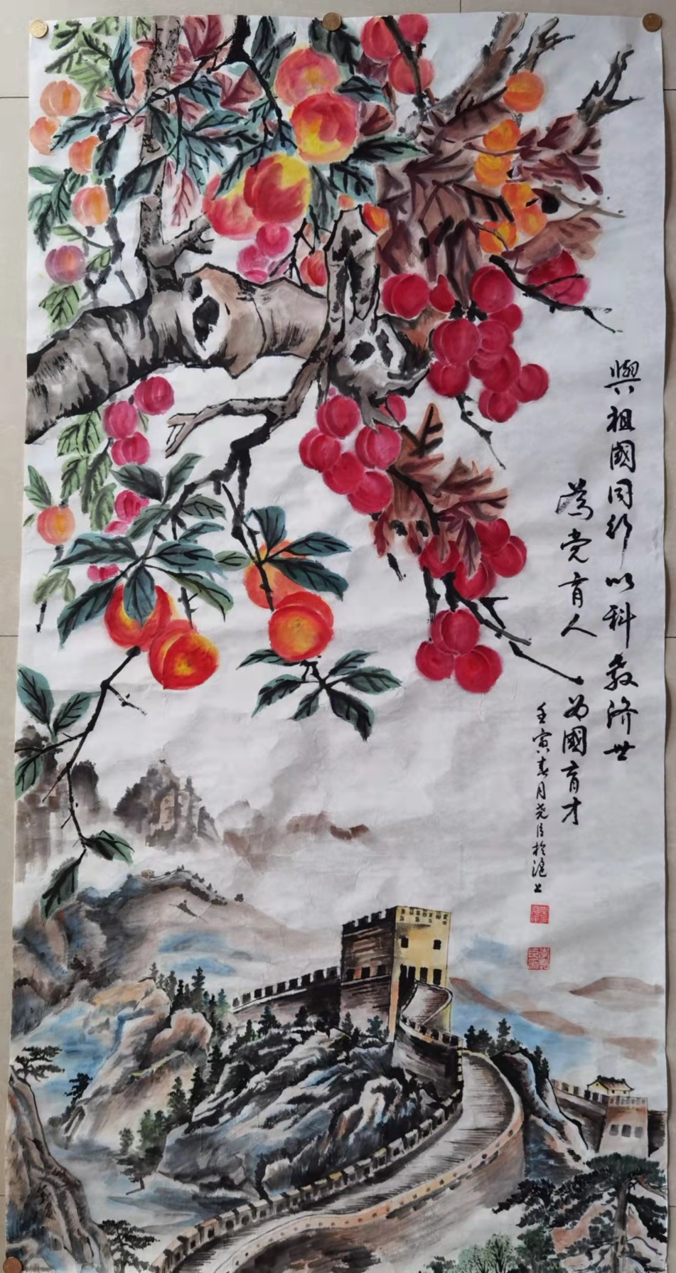 李尧臣创作的《与祖国同行》,勾绘了壮丽的长城和丰硕的果实,题字“与祖国同行,以科教济世,为党育人,为国育才”,表达了同济人心怀天下的家国情怀。