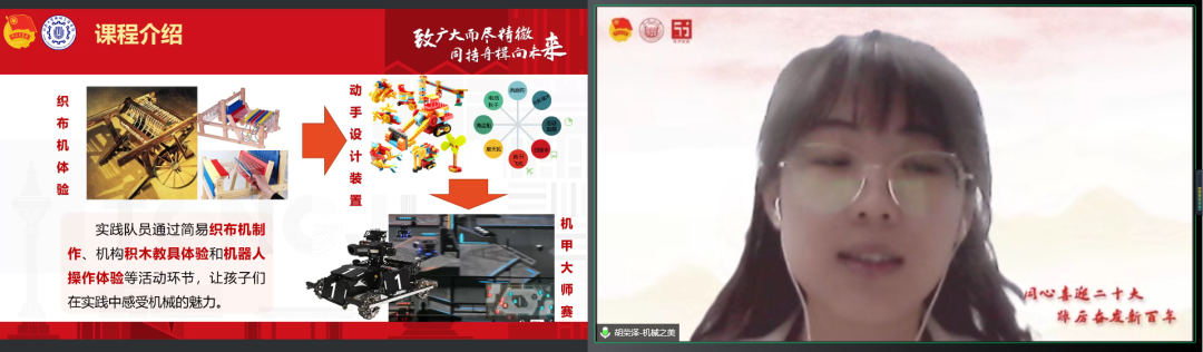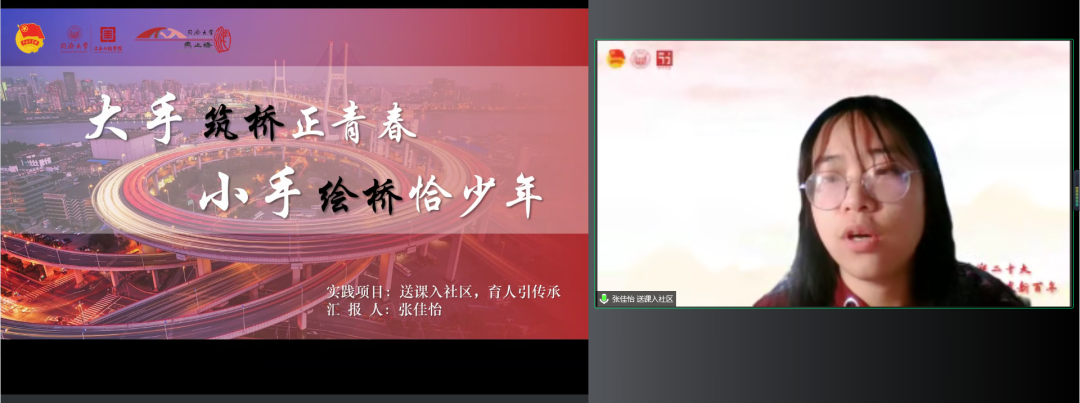 “送课入社区,育人引传承”项目团队代表张佳怡同学表示,要立足青年使命担当,积极“走出去”,到四平路街道基层团组织报到,响应国家“双减”政策,深入到广大青少年群体之中,以专业知识、自身经历科普桥梁知识、讲述桥梁故事、传播红色精神,经过精心的课程设计,为小朋友们带来了3场集专业性与趣味性为一体的直播课,累计服务百余人次,课程深受家长与小朋友好评,并得到上海杨浦等媒体的报道。