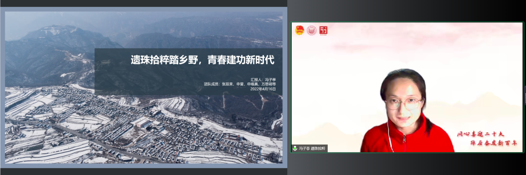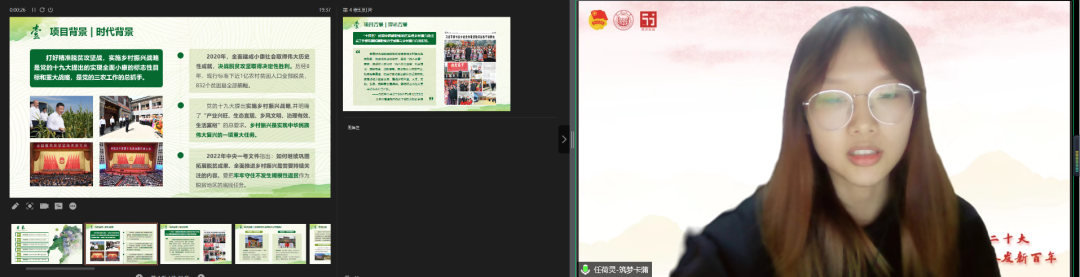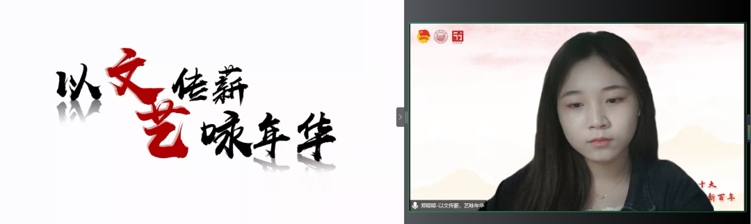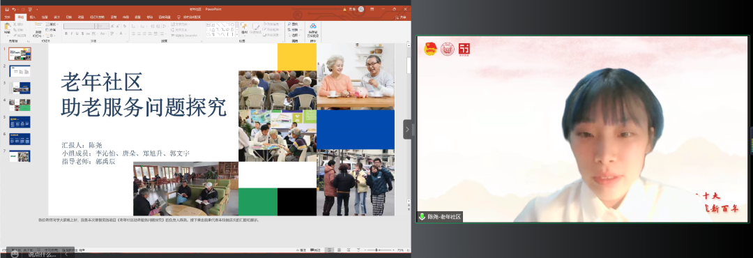 “以文传薪,艺咏年华”项目团队代表郑婷婷同学为大家介绍了该项目探寻文学艺术作品,追溯革命岁月与红色记忆,并通过推文与视频的形式传播红色基因的初心和使命,分享了团队成员借返乡契机到访红色遗址、访谈退役老兵并结合相关文学艺术作品制作推广视频、推文以及文创产品的实践过程,将文、艺等大众喜闻乐见的娱乐形式与红色记忆的唤醒相结合,向观者提供了解红色人物及相关内容的渠道,提供了解人物的新视角。