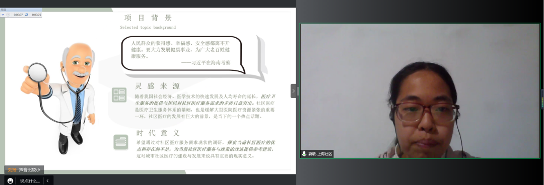“上海社区医疗服务需求现状和政策建议”项目团队代表夏敏同学介绍了在医学院王格格老师的带领下,团队聚焦社区医疗,以上海市普陀区甘泉街道的社区卫生服务为主要研究对象,通过发放问卷和人物采访的调研形式,从居民、社区工作人员、社区医生三个角度入手,多方位了解甘泉街道社区卫生服务需求现状,并从健康宣教和慢性病管理两方面提出了改进建议,形成了成果集、健康APP选用指南、行动视频等多种实践成果,希望为社区医疗的建设提供青年思考。