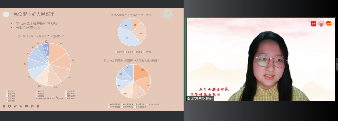 “青春视角解读‘人民城市’”项目团队代表龙艾琳同学分享了团队在寒假实践当中的各个阶段,以及对于“人民城市”进行解读的各个过程。从初期相关规划文件搜集积累概况认识,到中期问卷发放和群众视角的vlog记录,再到后期的深度访谈,从多个学科视角对于“人民城市”进行解读,项目的逐步推进也使得成员们对于“人民城市”的理解逐渐加深,充分体会到青春视角中的“人民城市”。
