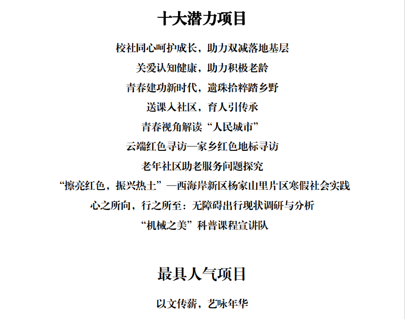 经过评委老师的综合评判以及网络投票,最终评选出“同济大学寒假社会实践十大潜力项目”和“同济大学寒假社会实践最具人气项目”。