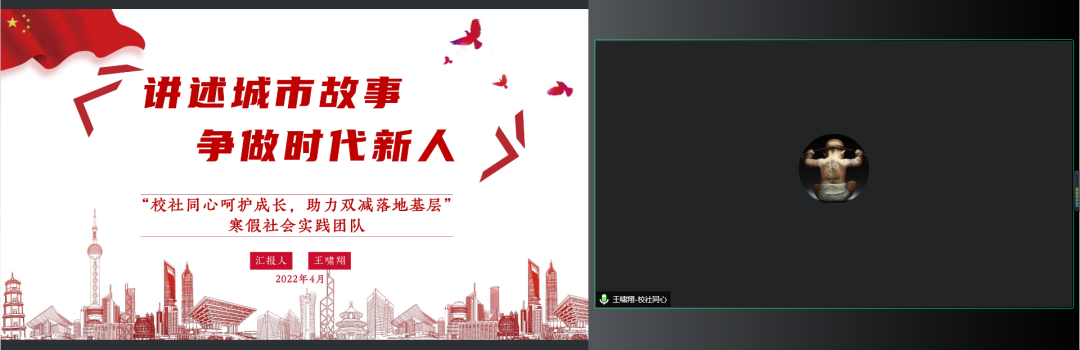 4月16日,“同践青春,济梦未来”2022年寒假社会实践潜力孵化项目线上交流展示会举行。校团委、法学院、马克思主义学院相关负责人,青年报记者,校团委实践部、嘉定校区团工委社会实践部、各学院实践部的学生骨干以及2022年寒假社会实践潜力孵化项目团队成员等在线参加会议。