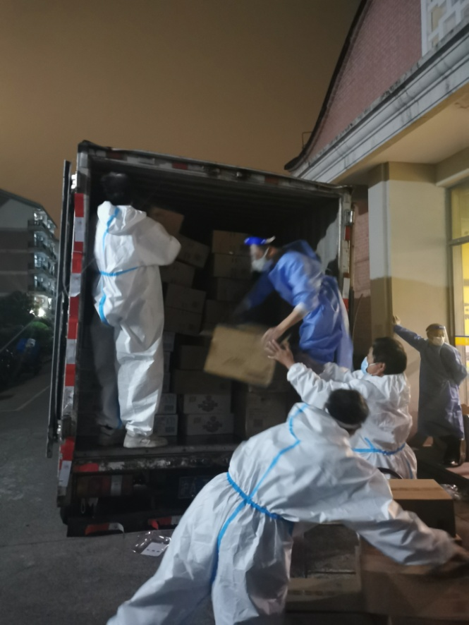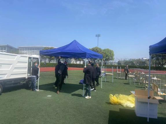 会务公司采购部紧急采购各类生活物资包括折叠床、床垫、户外帐篷、被子等各类生活物资送至各校区,同时紧急组建了物资采购组、卸货配货组、车辆调度组、仓储组、综合协调组积极配合物资采购、收货、消杀、大仓卸货、配货、装车、发货、楼宇点卸货等工作。目前每日供应水4000桶、方便面12000桶、火腿肠13000根、牛奶23000盒、饼干5000包。