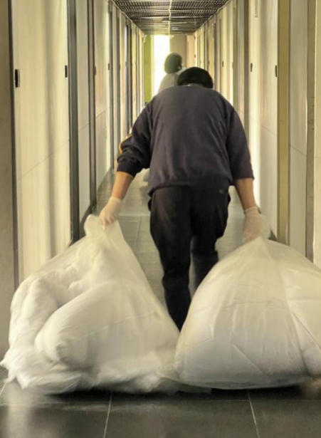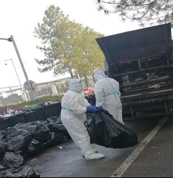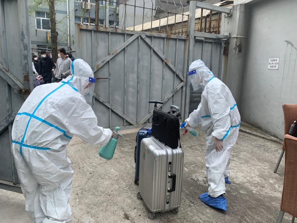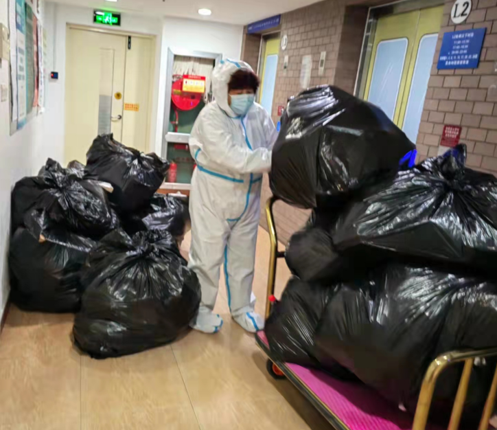 学生社区员工响应号召,坚守岗位,共克时艰,全力以赴守护好学生社区的安全防线。彰武路校区8号楼内有1328名学生,仅有6名宿管阿姨,工作量成倍增加,人手严重不足,她们每天要运送近300包生活垃圾,要对26层楼进行每日7遍的卫生消杀。这些阿姨均龄50岁以上,身着大白服的她们每天清晨6点就开始了一天的忙碌,清运垃圾、卫生消杀、搬运物资,直到深夜才能卸下一身的疲惫,在临时床铺上休息。面对重重困难,她们不辞辛苦,把学生安全放在第一位,连续40多天日夜坚守在疫情防控第一线,保障学生社区的安全。