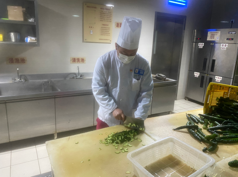 彰武路校区食堂主管常仁本近50天来靠行军床和睡袋每天睡三四个小时,在封控期原材料品种有限的情况下仍然坚持更换菜品花样,做到营养丰富、荤素搭配。极少的休息时间,连抽转的工作任务让食堂工作人员身心俱疲,他主动顶岗替大家分担工作,确保了供餐服务工作安全有序高效,在他的带领下,全体员工齐心协力,努力打赢“舌尖上”的防疫战。