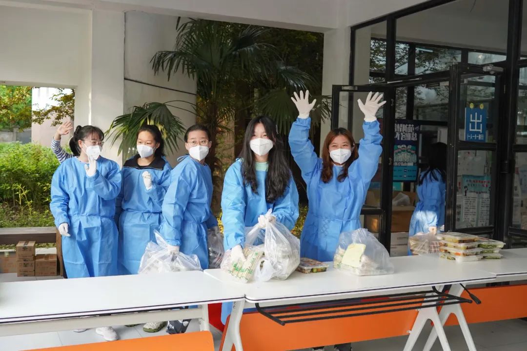 晚餐时分,方守恩、陈杰来到友园7-8号、9-10号学生社区。几位教师正开着一辆辆三轮电瓶车,从食堂给同学们送来了打好包的热乎乎的盒饭。盒饭到楼层,友园7号楼作为校区学生最多的宿舍楼,通过食堂、送餐教师和学生志愿者的高效衔接,实现了餐食集中配送到宿舍楼后半小时内分发给学生。